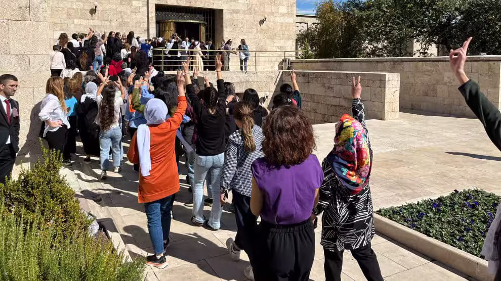 “We roepen alle sociale krachten op om zich bij ons aan te sluiten op deze weg”, zei Tuncel aan het einde van de actie. De vrouwen kondigden aan dat ze hun mobilisatie zouden voortzetten – niet alleen voor de vrijheid van Öcalan, maar ook voor een democratische, vreedzame toekomst. Een grotere groep TJA-activisten marcheerde vervolgens het parlement binnen met overwinningsgebaren en kreten van “Bijî Serok Apo” [Lang leve leider Öcalan] om deel te nemen aan de groepsbijeenkomst van de DEM-partij.