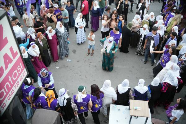De vrouwen verzamelden zich in het Vredespark en marcheerden achter een spandoek met de tekst ‘Met hoop naar vrijheid lopen’, terwijl ze slogans scandeerden als “Jin, Jiyan, Azadî” (Vrouw, Leven, Vrijheid), “Het recht op hoop kan niet worden uitgesteld” en “Geen leven zonder de Leider”. De demonstranten werden verwelkomd door duizenden mensen en trokken verder naar het districtskantoor van de Peoples’ Equality and Democracy Party (DEM Party) in Akdeniz, waar ze de halay (een traditionele Koerdische cirkeldans) dansten en posters en spandoeken van Abdullah Öcalan aan het gebouw hingen.